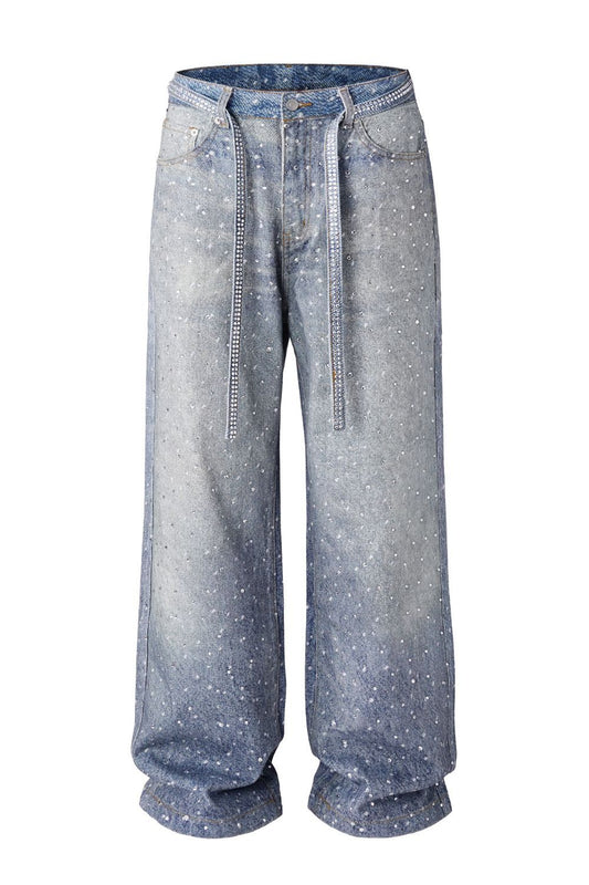 Men's Washed Rhinestone Jeans with Rhinestone Belt