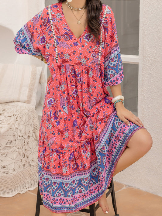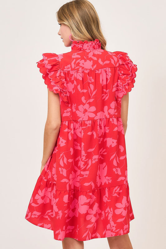 Umgee Full Size Two Tone Floral Print Ruffle Cap Sleeve Mini Dress Plus Size