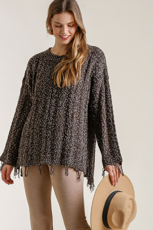 Sold outUmgee Full Size Frayed Hem Cable Knit Round Neck Sweater Plus Size