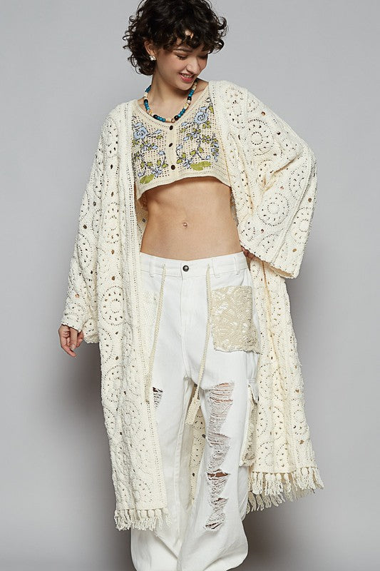 Sold outPOL Crochet Fringe Open Front Longline Cardigan